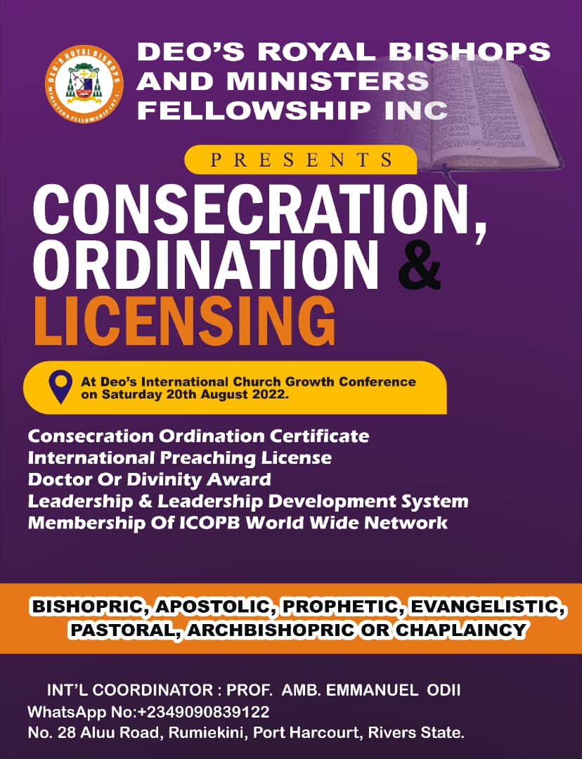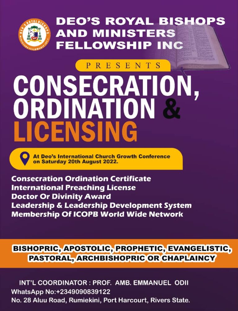 Deo’s Royal Bishops and Ministers Fellowship International Inc. is a global Episcopal and Apostolic Network of ministers actively working with Jesus Christ in one capacity or the other. The network is global in scope and is interdenominational in nature. The interest of the ministers in DRBMFI is to expand the kingdom of Jesus Christ here on earth.w